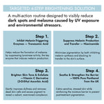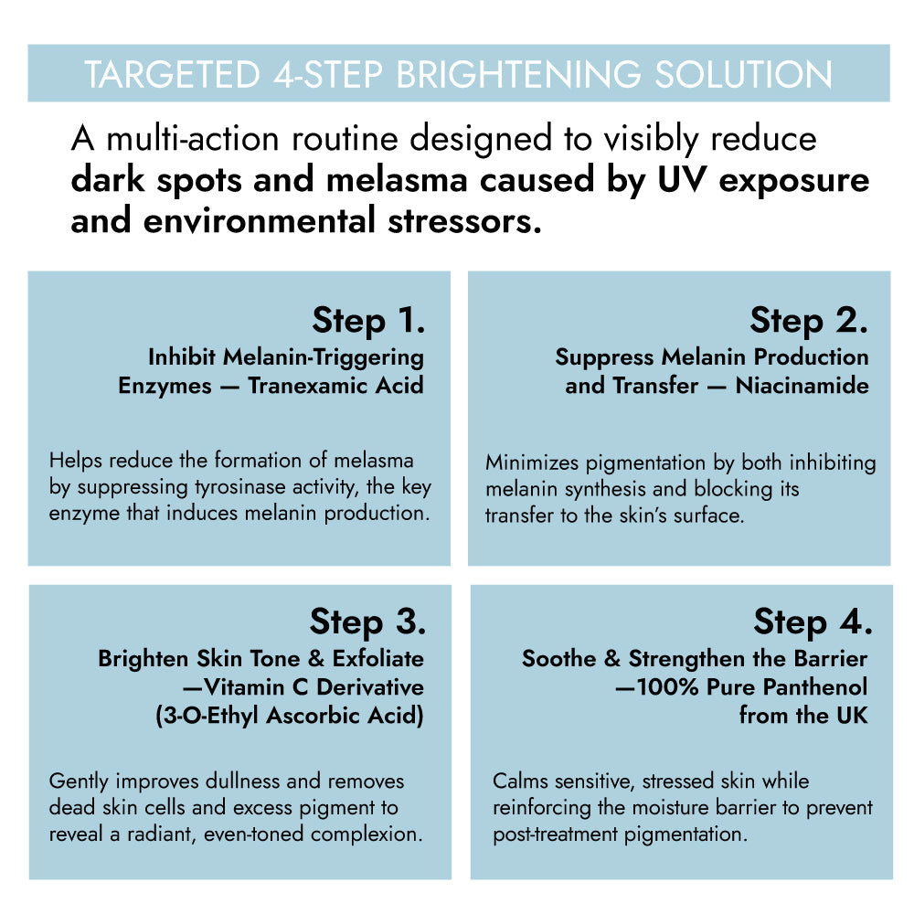A multi-action routine designed to visibly reduce dark spots and melasma caused by UV exposure and environmental stressors.
